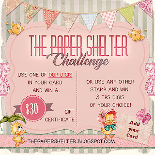 En el reto del blog The Paper Shelter esta semana, como todas las semanas, el fantástico premio habitual! El ganador ganará un cupón de la tienda de $30 si ha usado un producto Paper Shelter en su entrada (puede elegir la imagen precoloreada, el digital en blanco y negro o el papel digital que viene en el juego), o 3 imagenes digitales de su elección, si ha usado otra marca. Puedes participar en el desafío hasta 3 veces, siempre que hayas usado un producto Paper Shelter en al menos una de ella